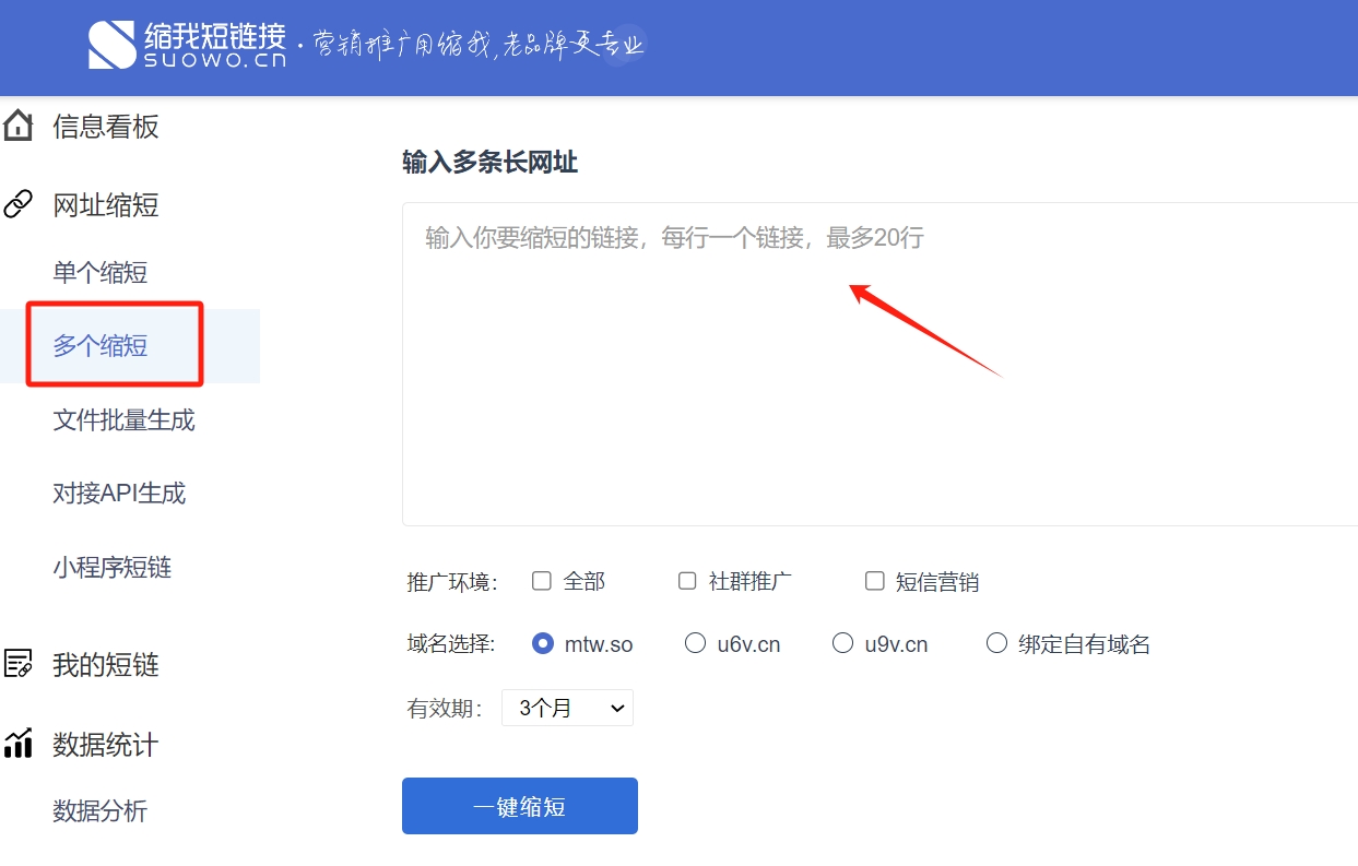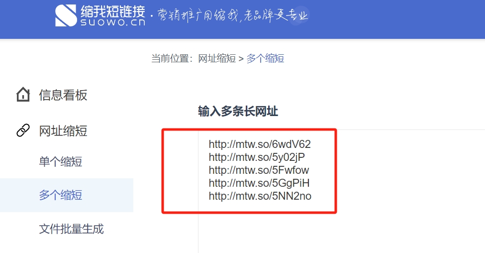 在缩我后台找到【网址缩短】-【多个缩短】,在文本框内输入要缩短的长链接,最多可输入20个,可以是多个相同长链接,也可以是多个不同长链接。