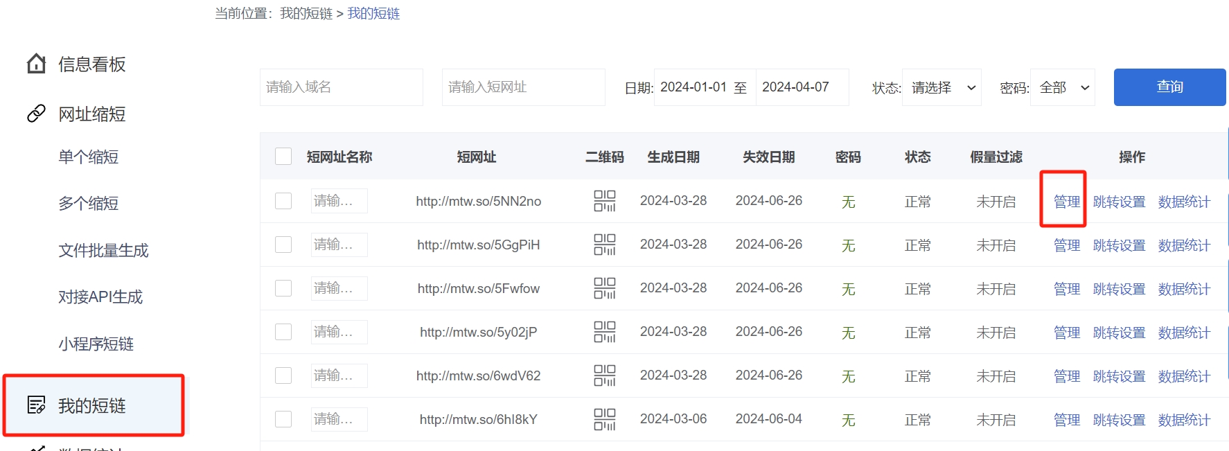 然后到【我的短链】,找到刚刚生成的短链接,点击它右边的【管理】。