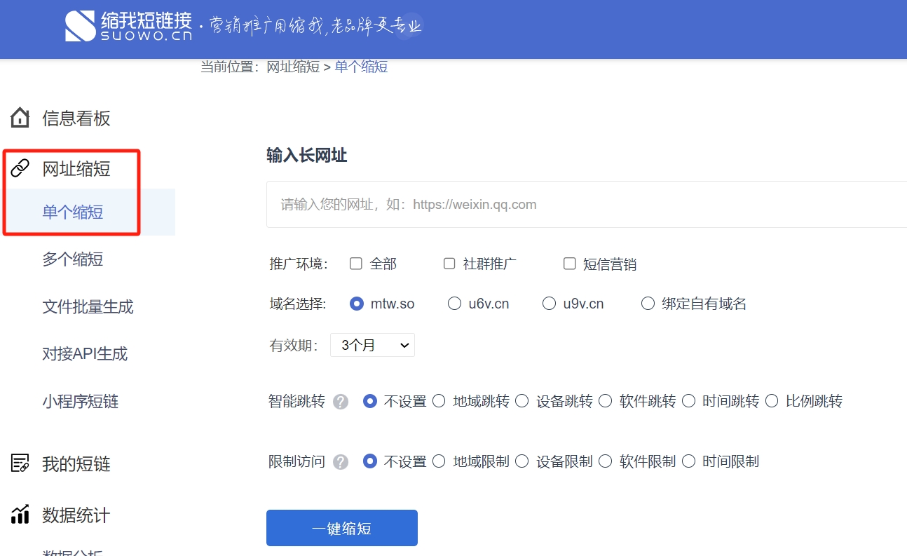 找到【网址缩短】-【单个缩短】,在输入框中粘贴你要设置密码的链接,根据需要设置推广环境、域名、有效期等,然后点击【一键缩短】。