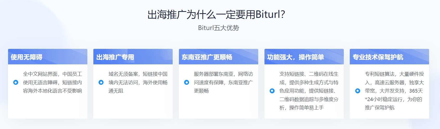 biturl的服务器部署在东南亚,近些年东南亚是海外推广的重要阵地,所以biturl对想出海东南亚市场的企业来说也是更友好,短链接、二维码的访问会更稳定、更快速。