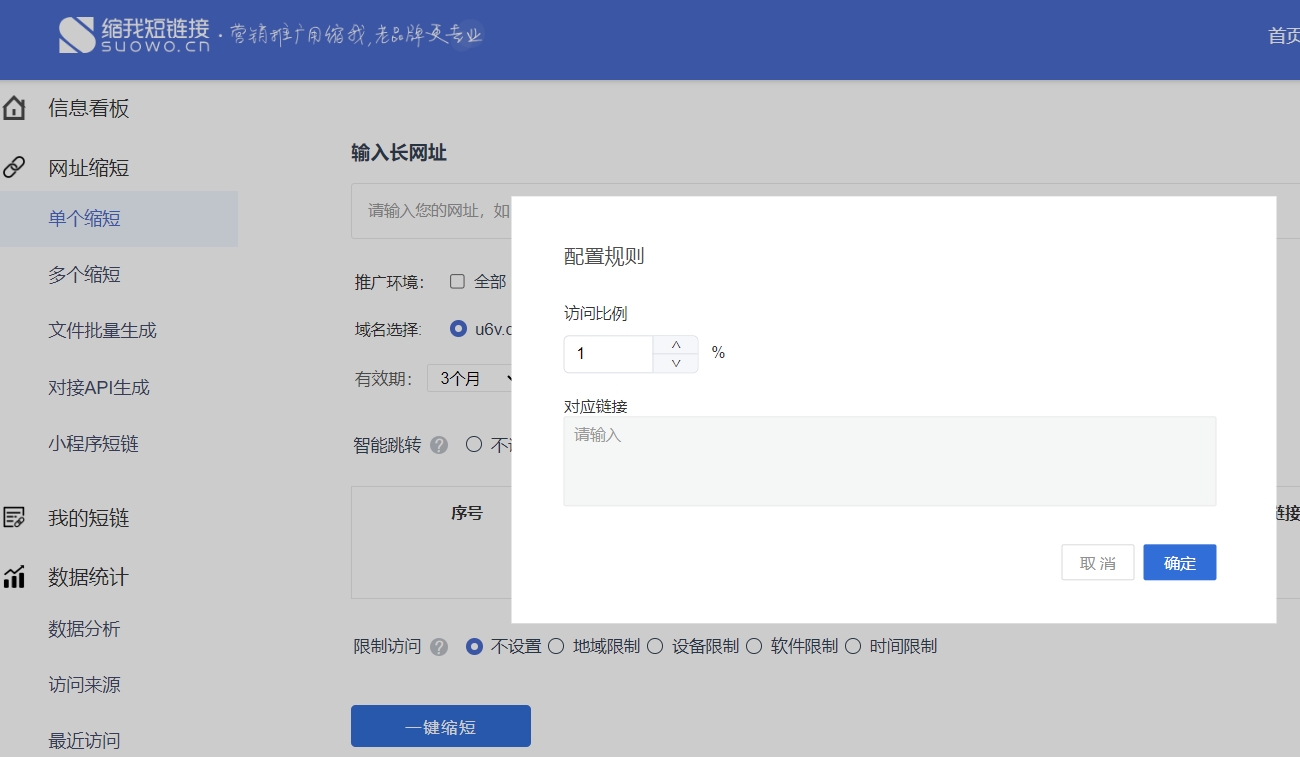 缩我短链接,老牌免费短链接工具,支持短链单个生成、多个生成,可修改短链长网址与有效期,提供短链专业访问数据统计与访问来源分析,支持假量过滤、智能跳转和限制跳转,支持短网址还原与解析,全网连通性好,稳定可靠,永久免费使用,防封防红防屏蔽防拦截,短信营销社群推广运营转化必备。