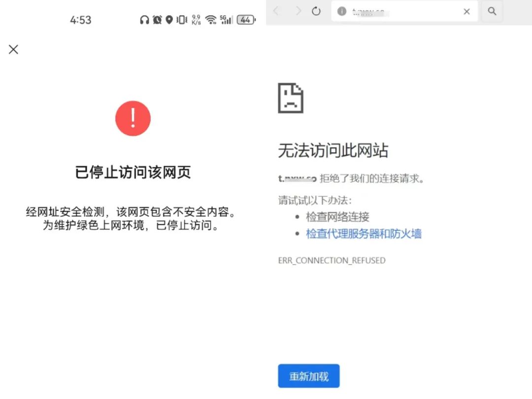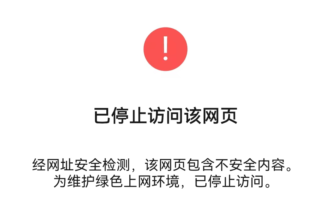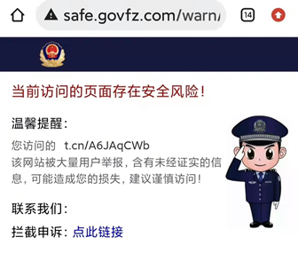 如果你的短链接是在手机或电脑上的浏览器打开,这些浏览器也会对短链接进行审核,若遇到有安全风险的链接,会进行类似如下的提示。