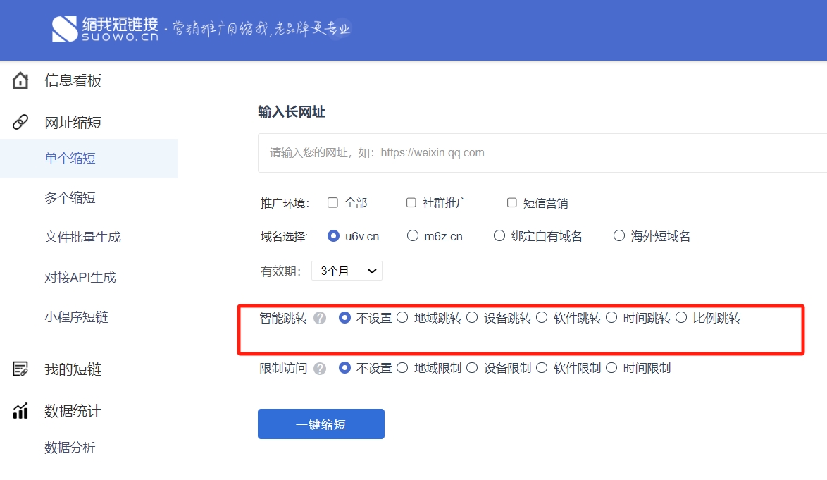 缩我短链接可自定义有效期,支持定期失效或永久有效。短链接可设置访问密码,提升链接安全性与私密性;可设置假量过滤,防止机器人恶意刷量;可设置智能跳转/限制访问,即针对不同时间段/地区/设备/比例的用户展示不同内容,方便企业进行a/b测试,以及实现个性化营销推广;可修改短链接对应原网址,以及还原短链接。